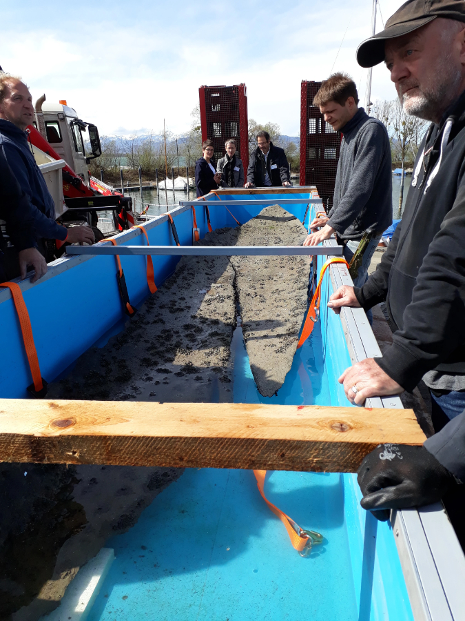 Der Einbaum wurde von den Archäologen in der Nähe von Lindau geborgen. Mit Hilfe von Gurten und einem Gerüstgestell blieb der Einbaum bis zum Transport unter Wasser. Der Einbaum wurde mit einem Bootskran aus dem Wasser gehoben und in das Spezialbecken auf dem Tieflader abgelegt. Für den Transport musste ein Teil des Wassers entfernt werden. Mit speziellen aufblasbaren Kissen wurde der Einbaum für den Transport stabilisiert.