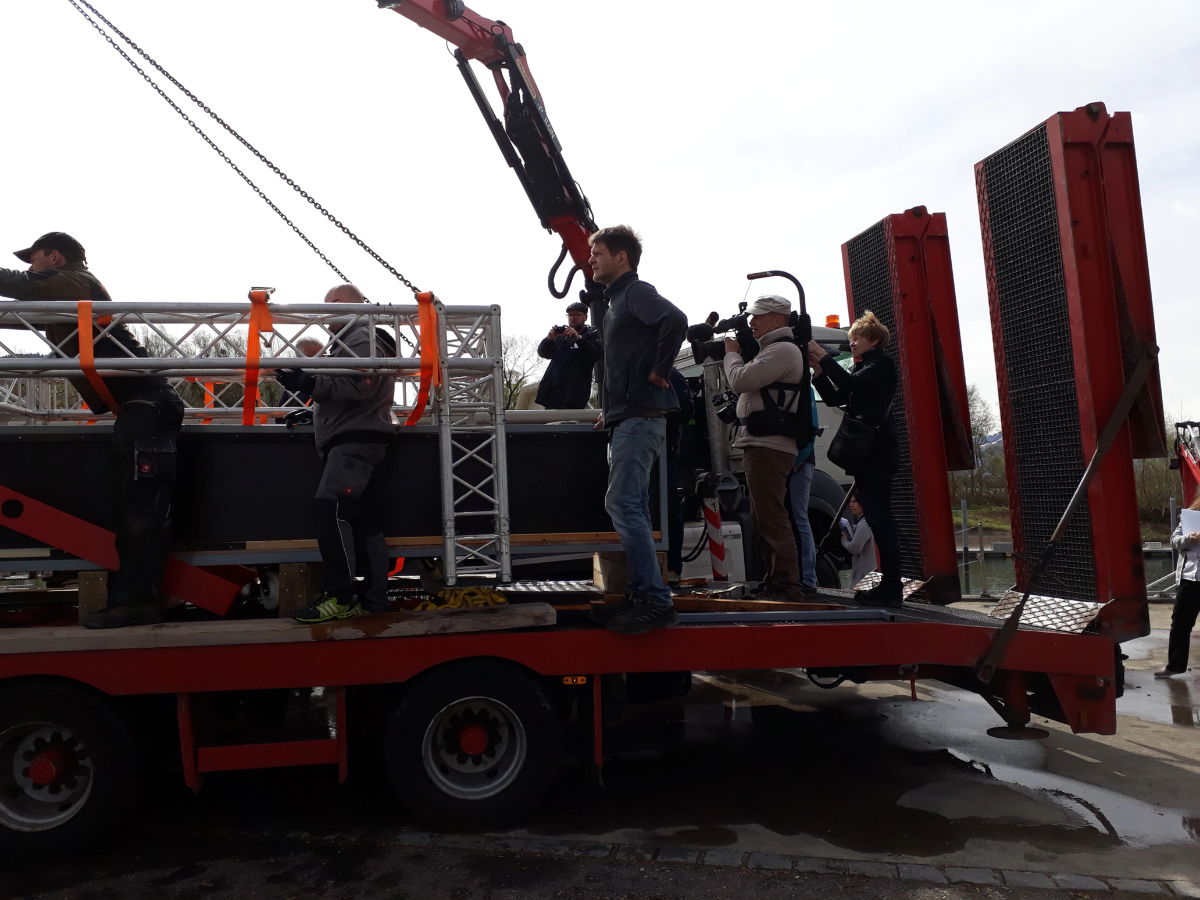 Zu guter Letzt wurde der Einbaum ins Außenlager des Archäologischen Museum gebracht. Dort liegt er nun in einer Speziallösung. Begleitet wurde das Projekt der Spezialisten von rentalift vom Bayerischen Fernsehen.